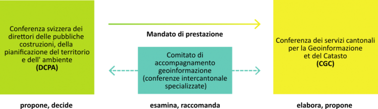 La Conferenza svizzera dei direttori delle pubbliche costruzioni, della pianificazione del territorio e dell’ambiente (DCPA), in qualità di conferenza di direttori competente, assume il ruolo di guida e la responsabilità politica del coordinamento dei Cantoni nel settore della geoinformazione. I compiti secondo il mandato di prestazione della DCPA sono specificati nel piano d'azione annuale con azioni classificate per area di compiti principale. Il Comitato di accompagnamento per la geoinformazione della DCPA esamina il mandato di prestazione, il piano d'azione e altre attività della CGC e formula raccomandazioni all'attenzione della DCPA.